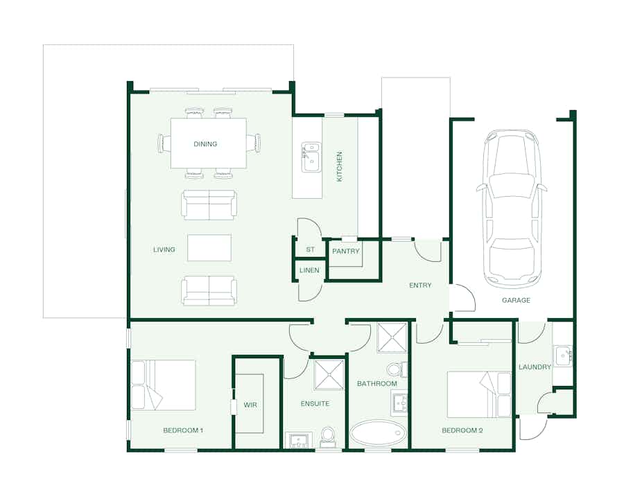 The surprisingly spacious Miromiro plan will fit your family perfectly now and for years to come. The flexible floorplan is largely defined by two areas - bedrooms and living. The living wing of the home boasts two generous living spaces and dining area.