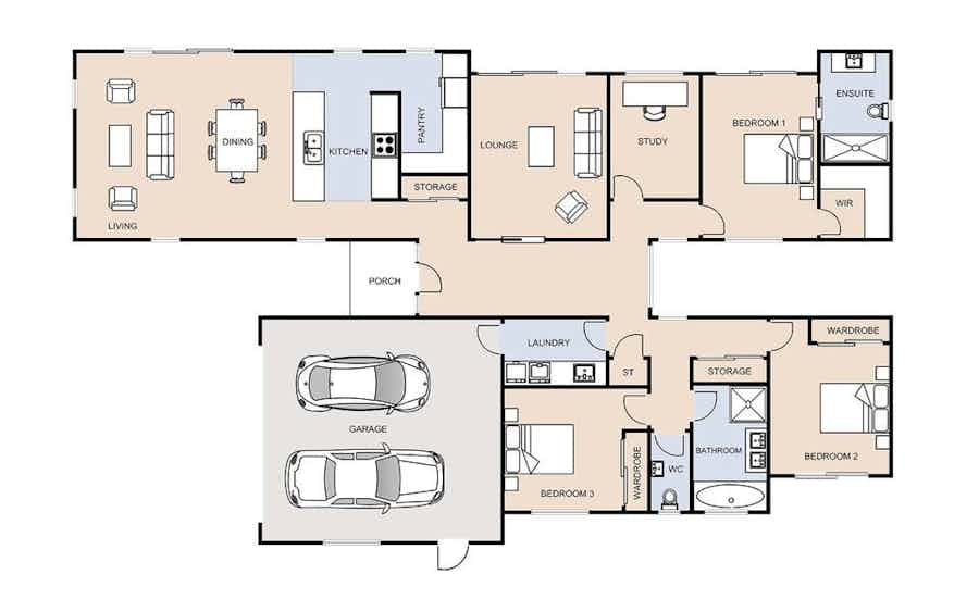 Our Brywood plan comes complete with two-living spaces, a study and three generous bedrooms. It ticks all the boxes.
