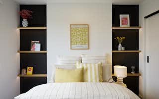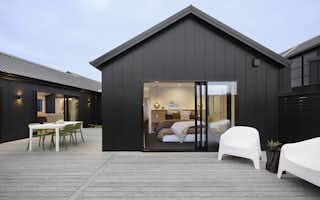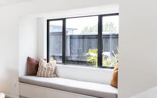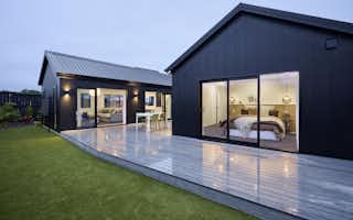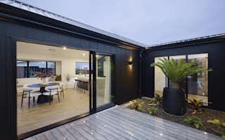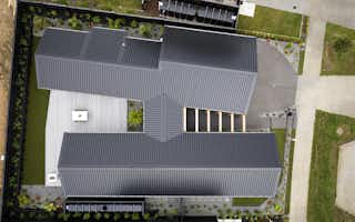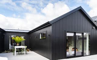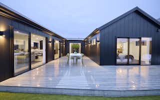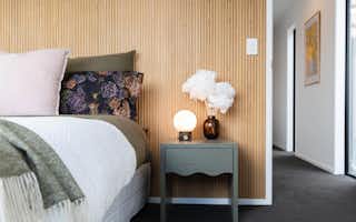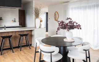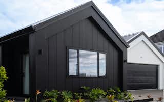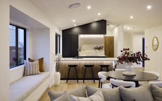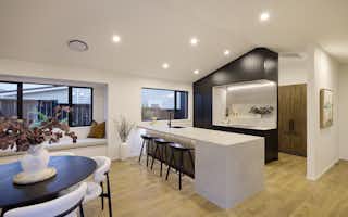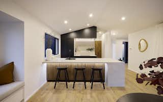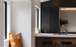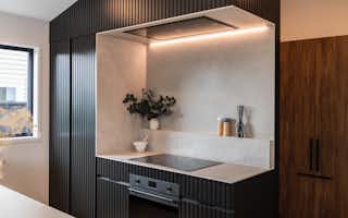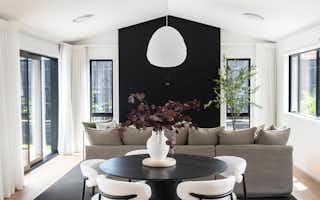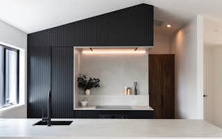 Bold dark vertical panelling runs from the pavilion-style exterior into the interior, highlighted by a striking high-arched feature wall in the lounge. A serene Cosentino Dekton benchtop in Argentium complements the design, creating a calming atmosphere. The home also includes a spacious two-car garage for added convenience.